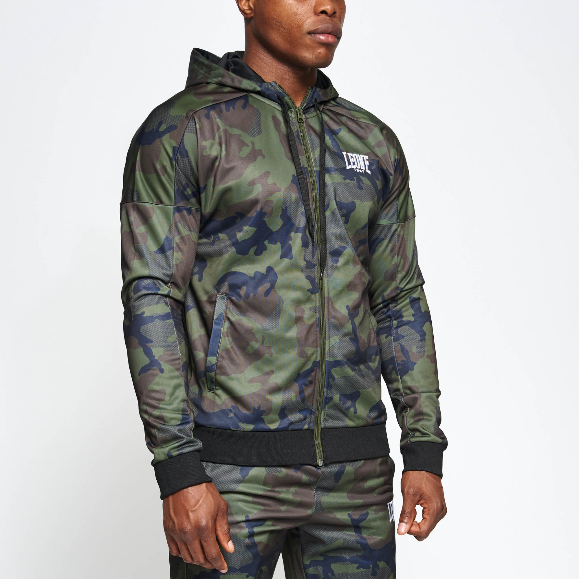 Felpa completamente camouflage, disponibile in due colori: verde e grigio camo. Un capo comodo, dotato di zip completa sul petto, cappuccio e polsini. Perfetta per essere indossata anche fuori dalla palestra.
